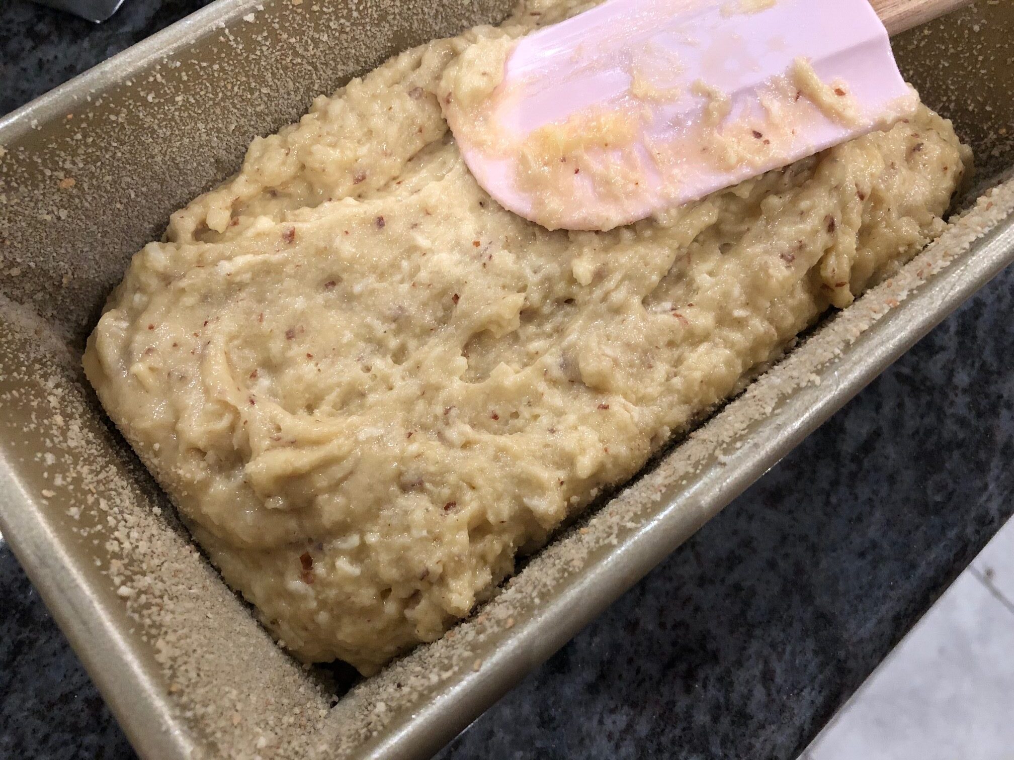 Mix it all together and pour it into a lightly buttered and breaded loaf pan.