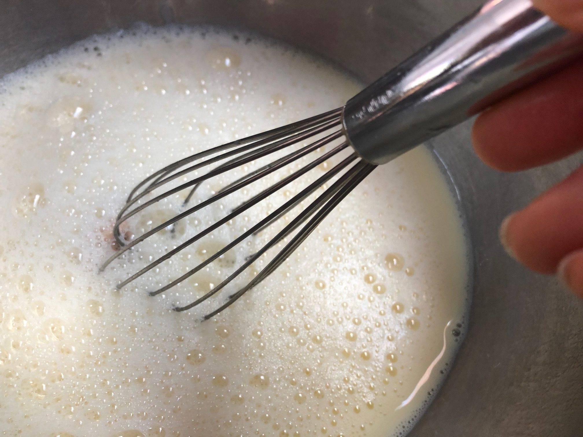 Warm up milk (do not boil it) and add eggs and sugar.