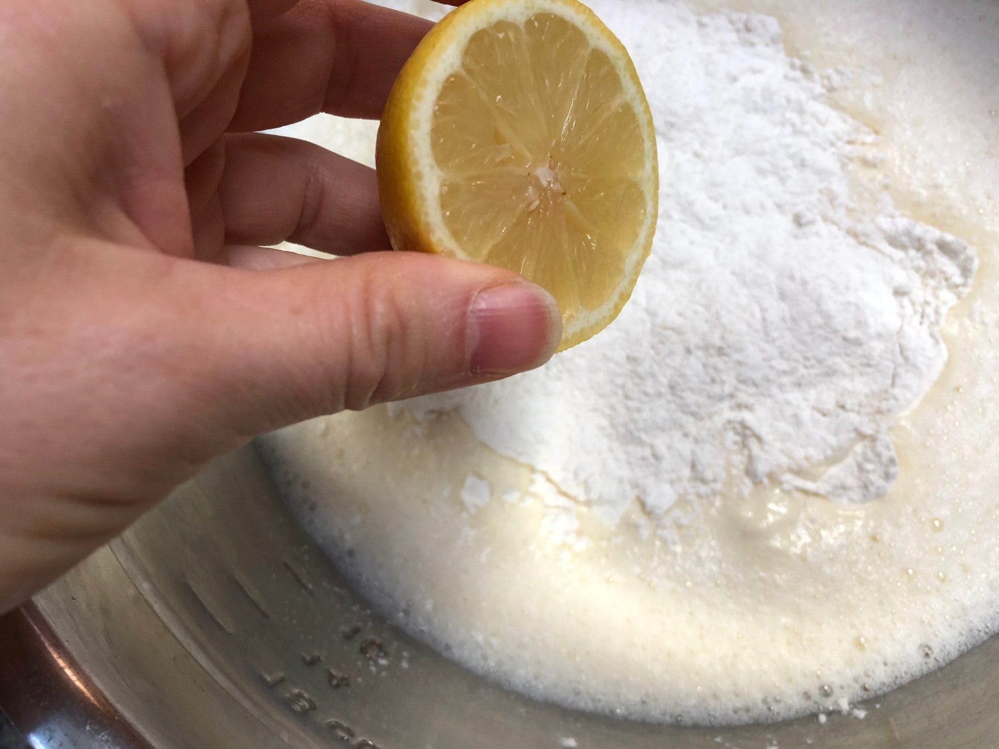 In a large bowl, add flour, salt, lemon juice, lemon zest, and vanilla.