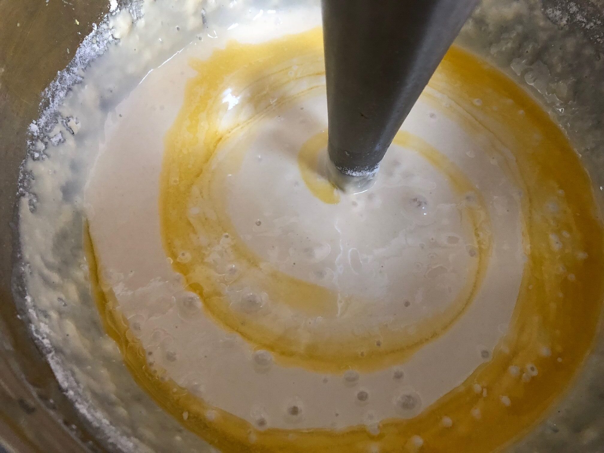 Combine the "wet mixture" with the flour, salt, lemon juice, lemon zest, and vanilla in a large bowl and mix it well together until the batter is smooth.