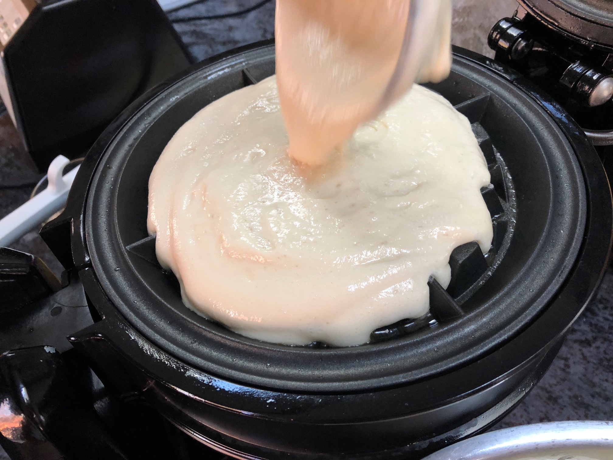 Heat up the waffle maker and with a ladle pour enough batter to spread evenly throughout the iron space.
