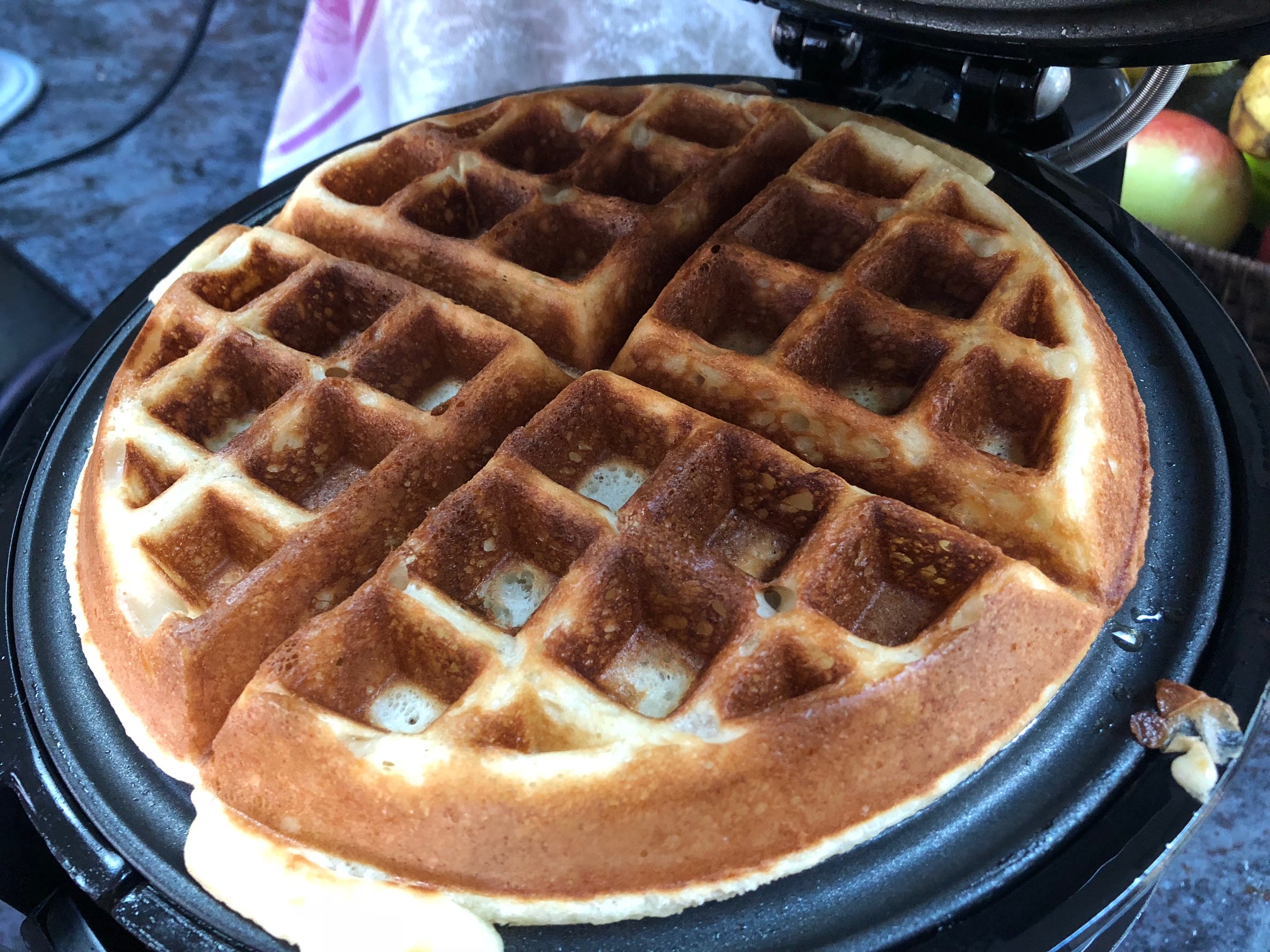 Each waffle takes about 4 minutes to bake.